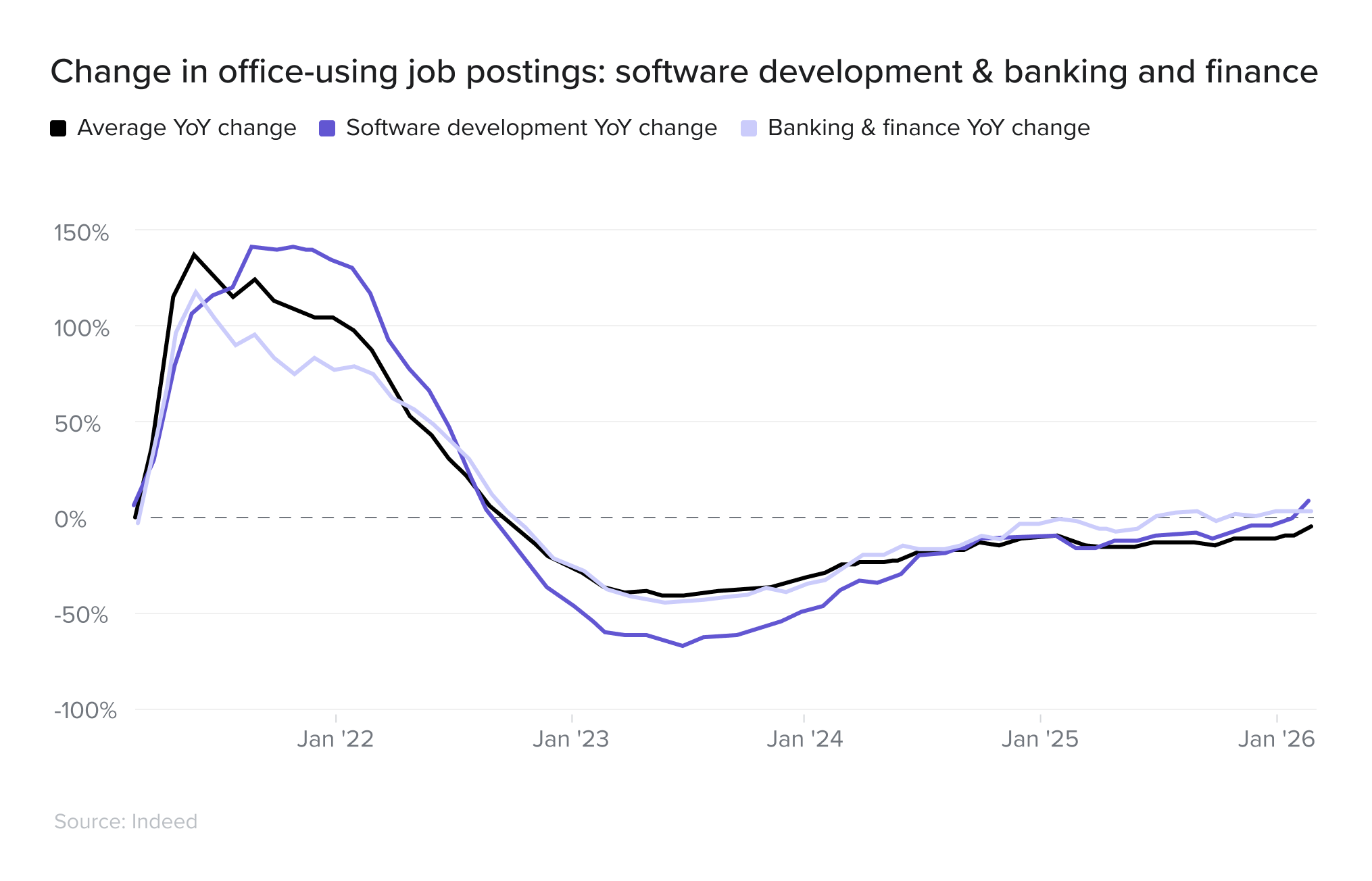 However, a more detailed look at specific roles through Indeed’s HiringLab suggests certain office-using occupations are still robust. Software developer postings, for example, were up 12 percent year-over-year in February 2026, and both software development and banking and finance roles have grown faster than other office-using positions over the last twelve months.